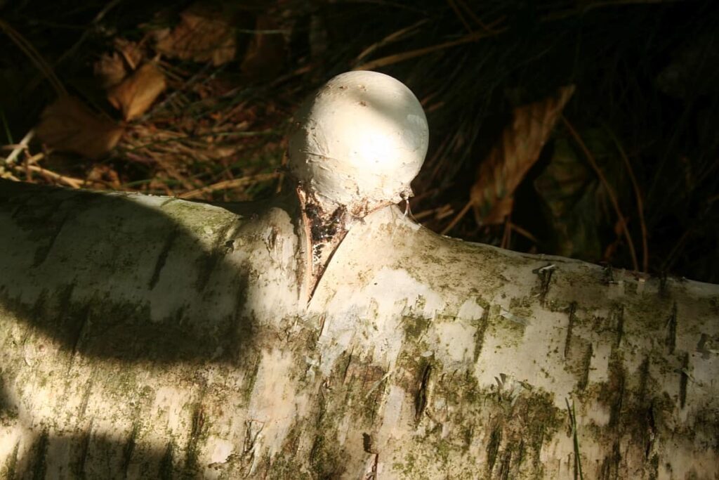 The Wood Dweller: These mushrooms exclusively grow on dead or dying birch trunks. The birch polypore does not grow from the forest floor, as we know it from other mushrooms, for example, the porcini (Steinpilz), bay bolete (Maronen), etc. Its mycelium rests deep within the dead birch trunks, and from there the fruiting bodies, the birch polypore, grow outward.