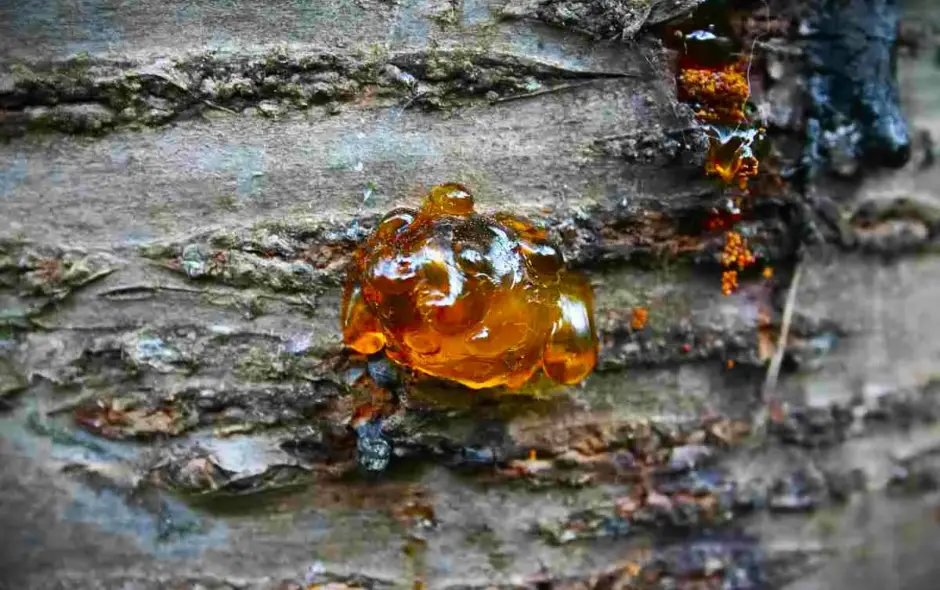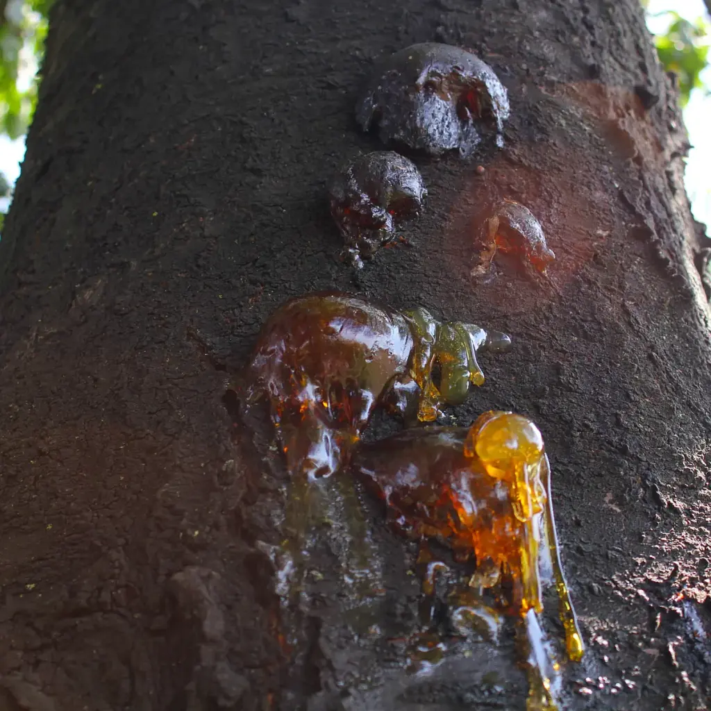 Many also call it cherry resin (Kirschharz), although it is not actually a resin in that sense. The sour cherry, in particular, secretes this tree gum abundantly. According to Ancestral Knowledge, if the cherry tree stands too wet, this golden cherry gum appears very frequently on its trunks and branches.