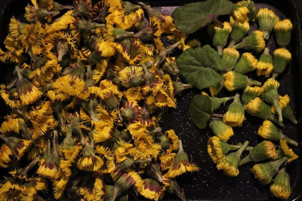 The Blossoms (Caution!): The delicate blossoms of the coltsfoot are not so easy to dry and sadly mold very quickly. When gathering, one should pay close attention that the blossom is still entirely funnel-shaped and not yet fully bloomed. For if you take fully bloomed coltsfoot blossoms with you, you will quickly see that they turn into a dandelion-like puffball very fast – even during the drying process. Drying must be done with the utmost care (very similar to comfrey roots).