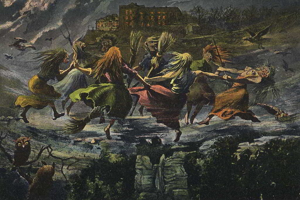 The Reinterpretation: Under the Christians, this ancient custom was reinterpreted into a wild, desolate gathering of fiends and witches. Hence, probably, the Christian belief that on Walpurgis Night the devil celebrates a grand feast with the sorcerers and witches (once it was the god Donar with his worshippers) on this or that mountain. After its end, the wicked men and women scattered in all directions to cause all sorts of harm and mischief to the people with their magical arts. Such was the belief of Christianity.
